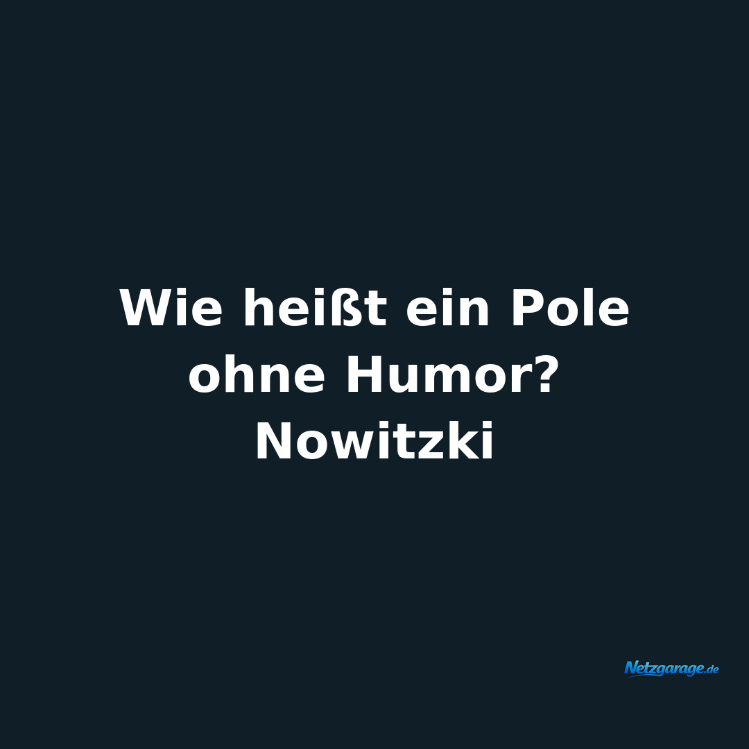 Allgemein 12.03.2026 Wie heißt ein Pole ohne Humor? Nowitzki 👍 1 👎 0 ↗ Teilen ⬇ Bild 💬 WhatsApp 👥 Facebook 𝕏 Twitter ✉️ E-Mail 📋 Link kopieren