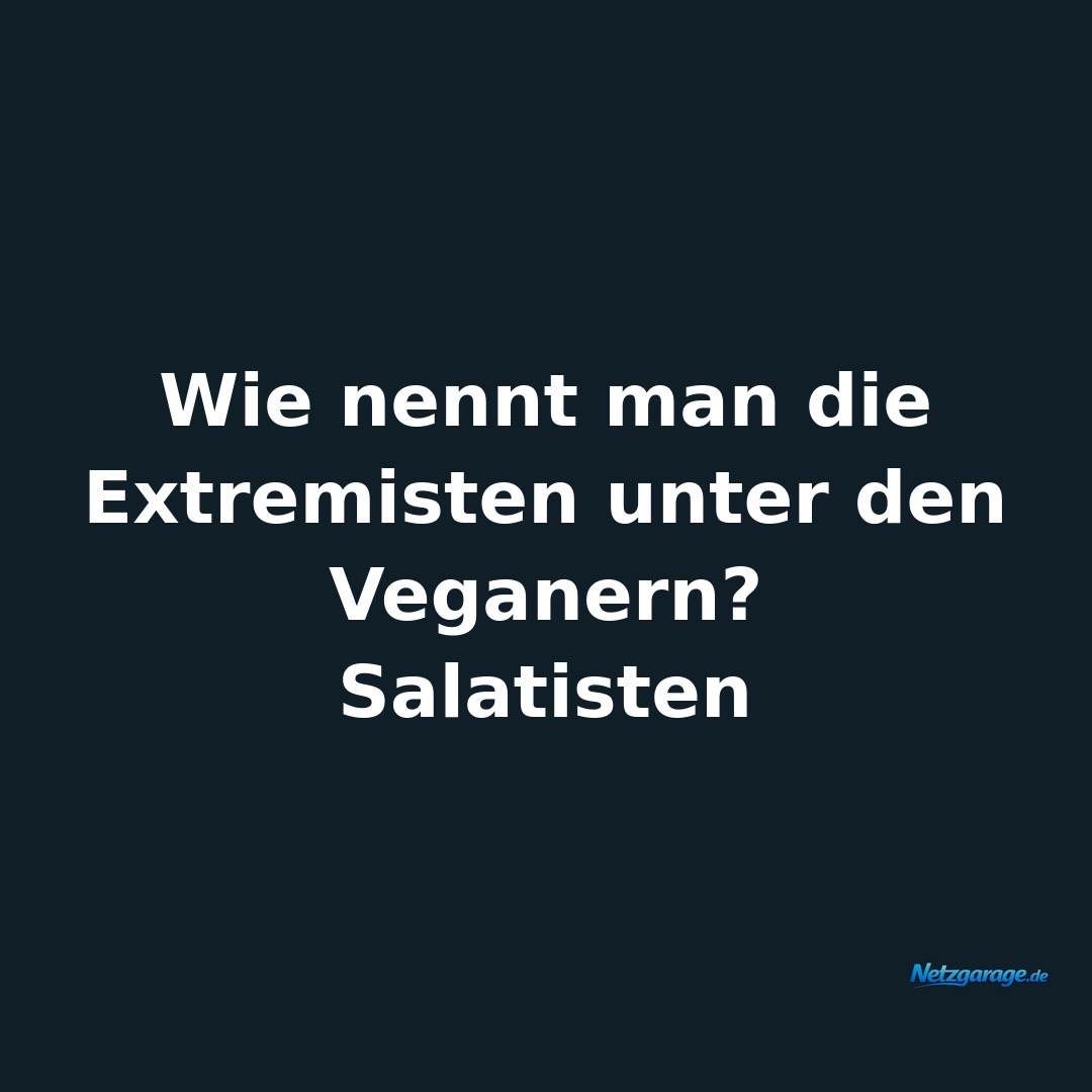 Allgemein 12.03.2026 Wie nennt man die Extremisten unter den Veganern? Salatisten 👍 0 👎 0 ↗ Teilen ⬇ Bild 💬 WhatsApp 👥 Facebook 𝕏 Twitter ✉️ E-Mail 📋 Link kopieren
