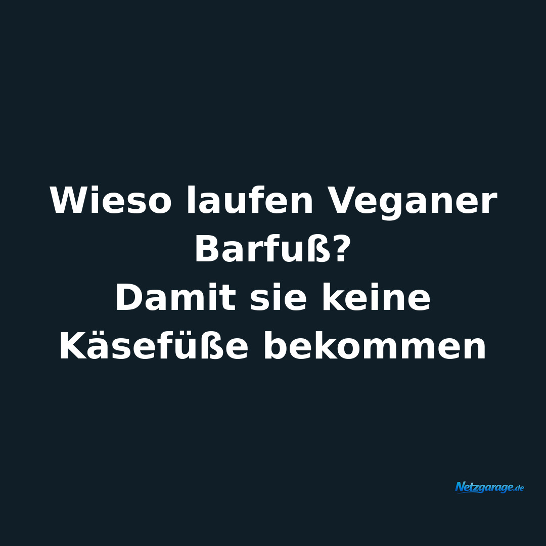 Allgemein 12.03.2026 Wieso laufen Veganer Barfuß? Damit sie keine Käsefüße bekommen 👍 0 👎 0 ↗ Teilen ⬇ Bild 💬 WhatsApp 👥 Facebook 𝕏 Twitter ✉️ E-Mail 📋 Link kopieren
